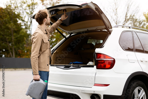 Young man taking out bottle of engine oil from trunk of SUV. Timely oil change in motor