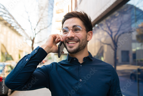 Young man talking on the phone outdoors.