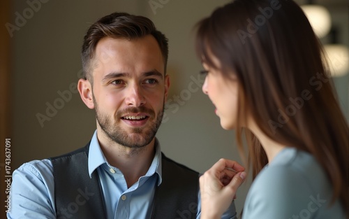 Young man telling gossips to his woman colleague. High quality