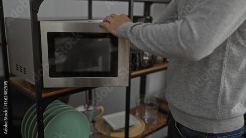 Young man uses microwave in office kitchen with dishes and cups on shelves in modern workplace environment.