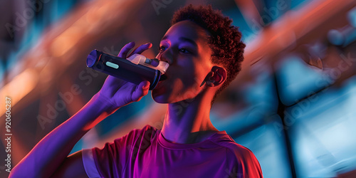 Young Man Using a Modern Inhaler in a Vibrant Setting Promoting Respiratory Health and Wellness