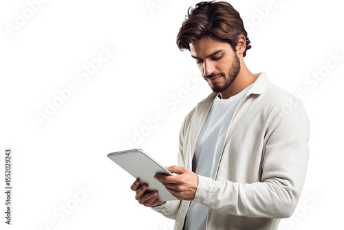 Young man using digital tablet with concentration, wearing casual outfit, isolated on white background for modern technology or lifestyle concept