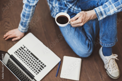 Young man using laptop computer at home, Blogger, journalist writing new article, Freelance work, working from home, distance education, online learning, study concept