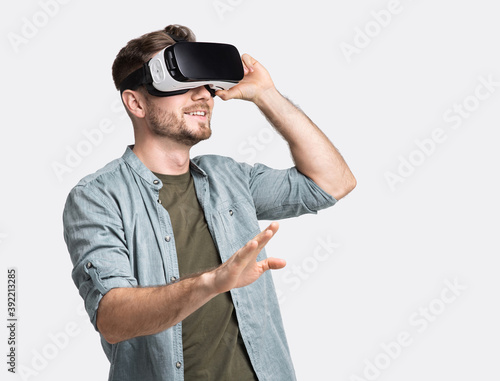 Young man using virtual reality headset isolated studio portrait, VR, future, gadgets, technology concept