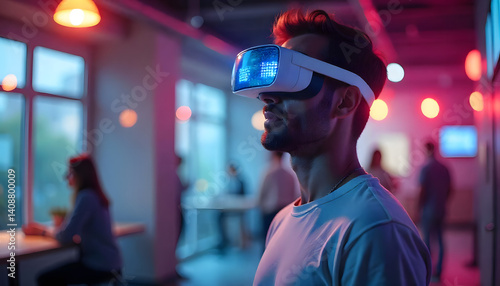 Young Man Using White VR Headset in Immersive Neon-Lit Environment