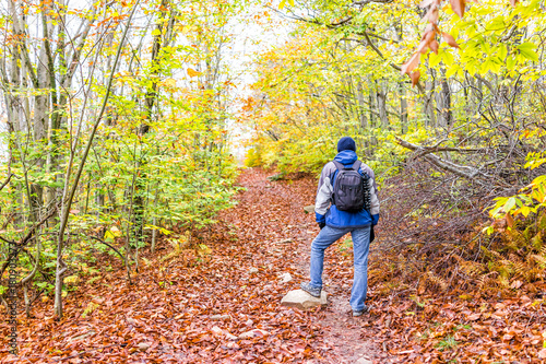 Young man walking on hiking trail through colorful orange foliage fall autumn forest with many fallen dry leaves on path in West Virginia