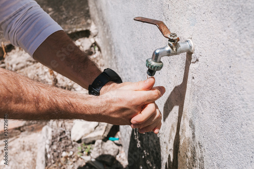 Young man washing his hands at a tap in a rural house. Selective focus.