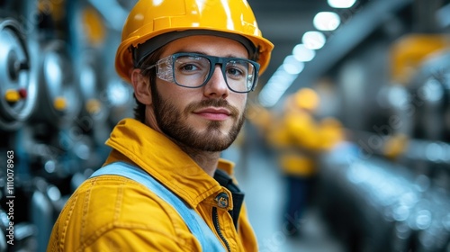 young man wearing a safety helmet and glasses stands in an industrial setting, showcasing professionalism and focus