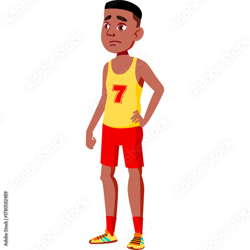 Young man wearing a yellow sports jersey with the number 7 and red shorts standing with a concerned expression on a white background