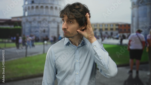 Young man wearing blue shirt cupping his ear gesture at pisa tower building on green lawn; curiosity.