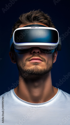Young man wearing virtual reality glasses, isolated on a dark blue background with a copy space area. Concept of futuristic gaming and the digital world, photorealistic and detailed.