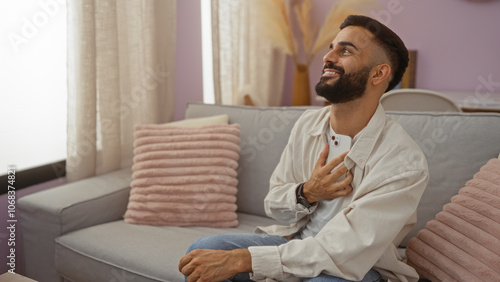 Young man with a beard smiling and holding a phone to his chest, sitting on a couch in a cozy living room with pink pillows and soft lighting.