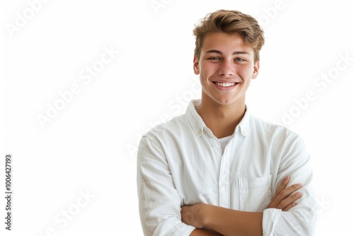 Young man with a bright smile and arms crossed, posing against a white background , background blur