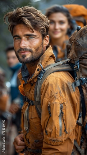 Young man with backpack in foreground, woman smiling in background, both appear dressed for hiking