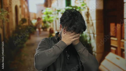 Young man with beard standing outdoors in vibrant street scenery holding head in hands looking stressed and thoughtful surrounded by plants and rustic buildings.
