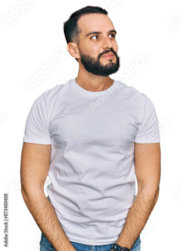 Young man with beard wearing casual white t shirt smiling looking to the side and staring away thinking.