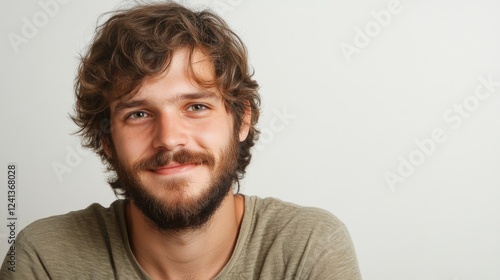 Young man with curly hair and beard smiling slyly against a minimalistic white background, capturing a friendly and approachable expression.