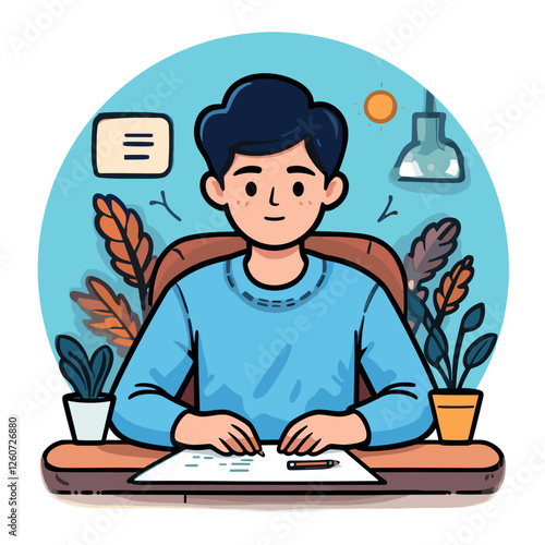 Young man with focused expression writing notes at a desk surrounded by plants and light