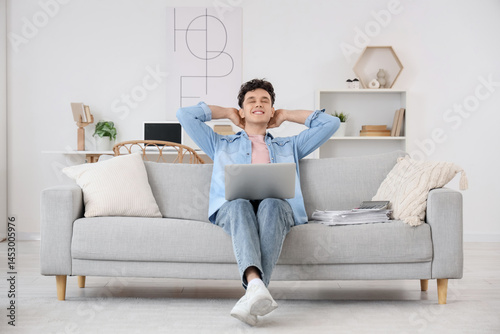 Young man with laptop resting on sofa at home