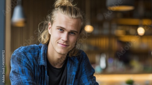 Young man with long blond hair wearing a blue plaid shirt smiling indoors at night.