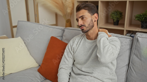 Young man with neck pain sitting in cozy living room of modern apartment, wearing comfortable sweater, looking pensive on sofa, surrounded by cushions and indoor plants.