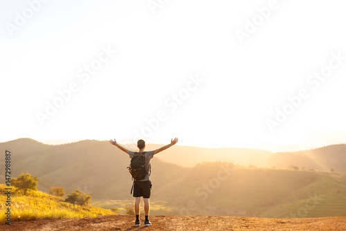 Young man with open arms at golden sunset, embracing mental wellness and relaxation through solo travel and immersion in nature