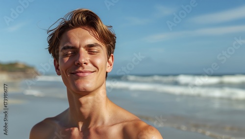 Young man with short hair smiling softly outdoors at the beach while enjoying sunlight, with eyes closed and ocean waves in the background under a clear blue sky.