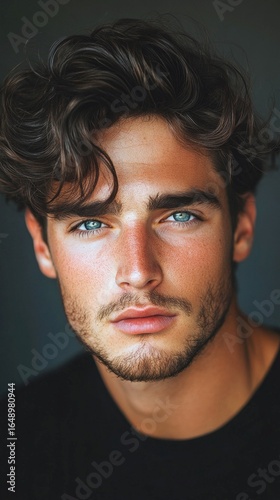 Young man with thick dark hair and bright blue eyes on neutral background, close portrait with emphasis on expressive face - cosmetics ads, fashion magazines, social networks for model portfolios.