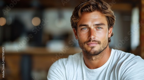 Young man with tousled hair and blue eyes sitting in a cozy café setting, looking confidently at the camera during the afternoon