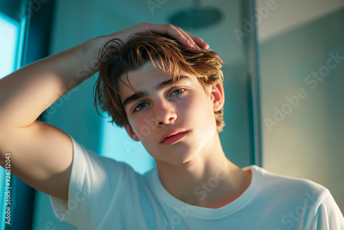 Young man with tousled hair in a white t-shirt, posing with a hand on his head, looking contemplative in soft natural light indoors