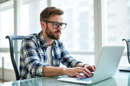Young man working at desk in sunlit room scene, man-casual and shirt-plaid
