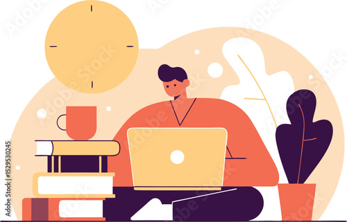 Young man working from home on laptop computer with coffee cup and books in cozy workspace remote work freelancer studying online