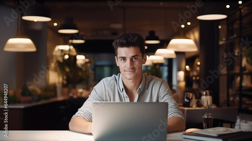 Young man, working on laptop, boy freelancer or student with computer in cafe at table,digital nomad,Remote video conferencing,Video Creator