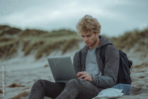 Young man working on laptop on tropical beach. Freelance and remote work concept