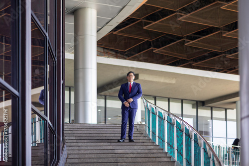 Young manager or CEO walking with confidence on a stairway in front of his office. Modern business leadership
