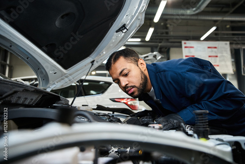 Young mechanic examines vehicle engine components with focus and determination in busy garage.