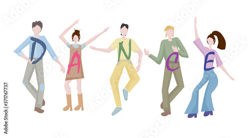 young men and women dancing together at a party or disco. It's time to relax and get some rest. Fun to celebrate a holiday or birthday. Dance moves, activity, entertainment. Flat design