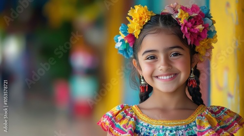 Young Mexican girl with a traditional dress and a playful smile.