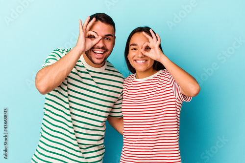 Young mixed race couple isolated on blue background excited keeping ok gesture on eye.