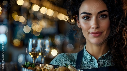 Young mixed race female bartender with curly hair smiling behind bar counter with wine glass and blurred bokeh lights in background. Hospitality industry concept.