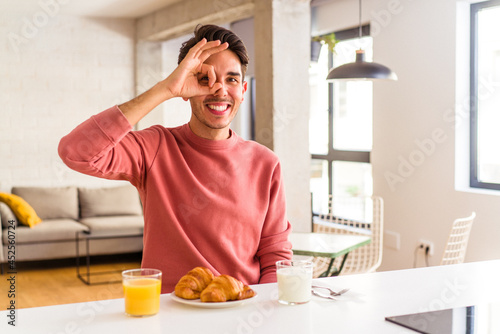 Young mixed race man having breakfast in a kitchen on the morning excited keeping ok gesture on eye.