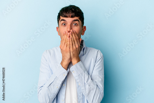 Young mixed race man isolated on blue background shocked covering mouth with hands.