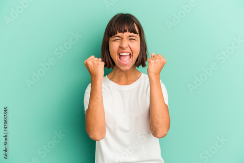 Young mixed race woman isolated on blue cheering carefree and excited. Victory concept.