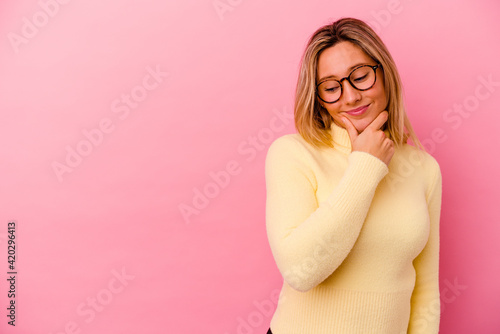 Young mixed race woman isolated on pink background touching back of head, thinking and making a choice.