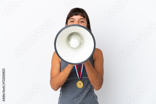 Young mixed race woman with medals isolated on white background shouting through a megaphone
