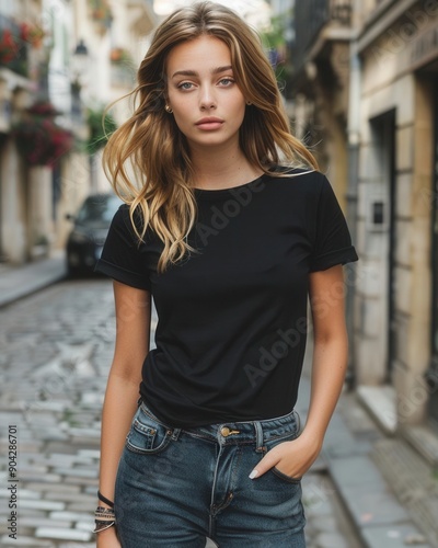 Young model in black t-shirt on a lively street, daylight, casual stance, shirt mockup template, urban environment,