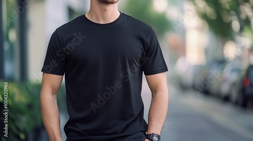 Young Model Shirt Mockup, Boy wearing black t-shirt on street in daylight, Shirt Mockup Template on hipster adult for design print, Male guy wearing casual t-shirt mockup placement .generative ai