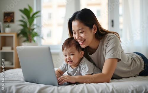 Young mom working remotely on laptop while taking care of her baby. High quality