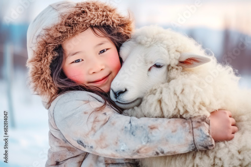 Young mongolian girl with sheep. Happy young mongolian girl portrait hugging a sheep in the winter background. Happy asian girl.