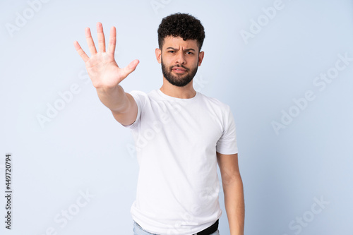 Young Moroccan man isolated on blue background counting five with fingers